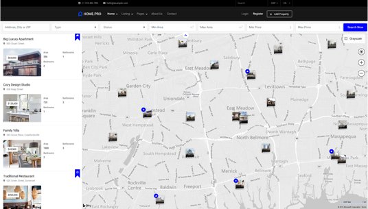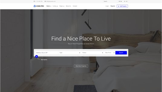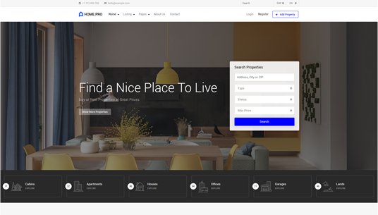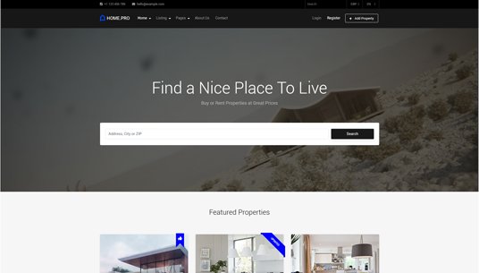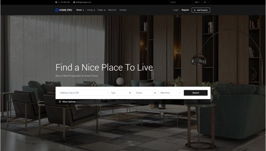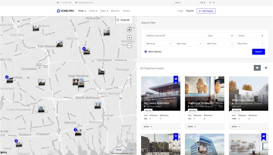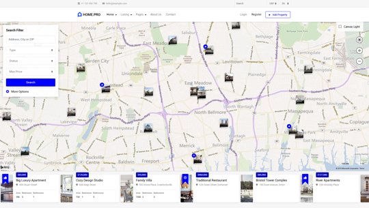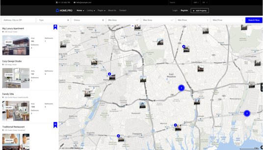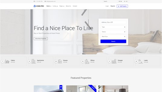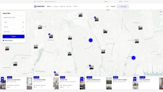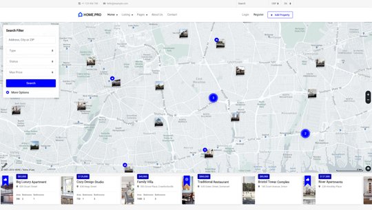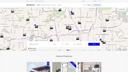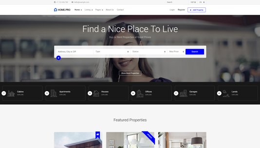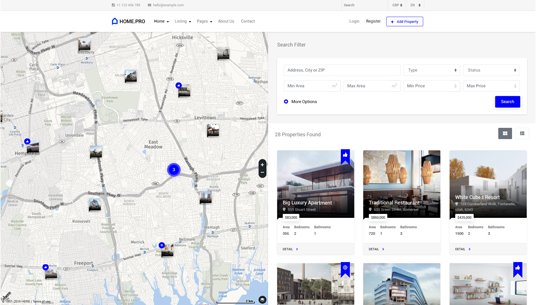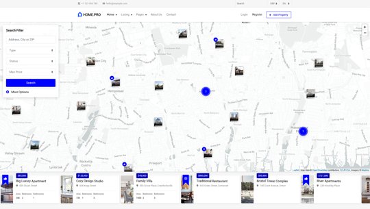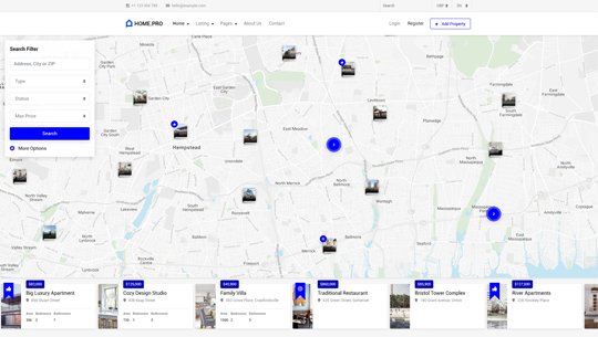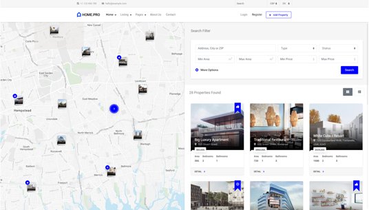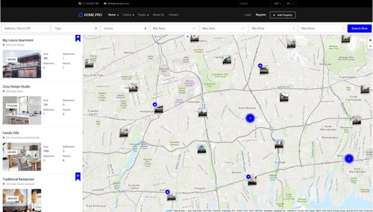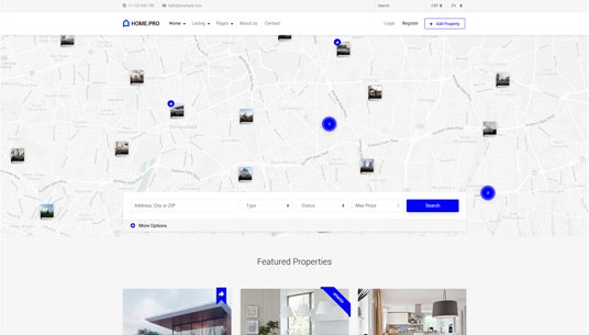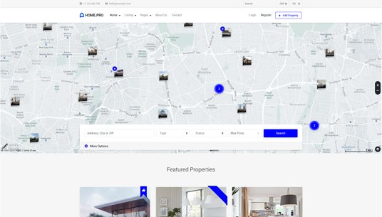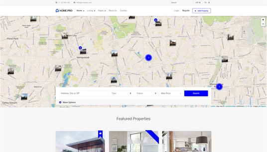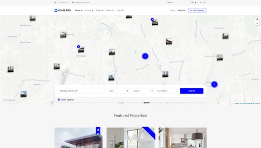 Choose between twenty map homepages, four slider or four static background image homepages. Every with different form style.